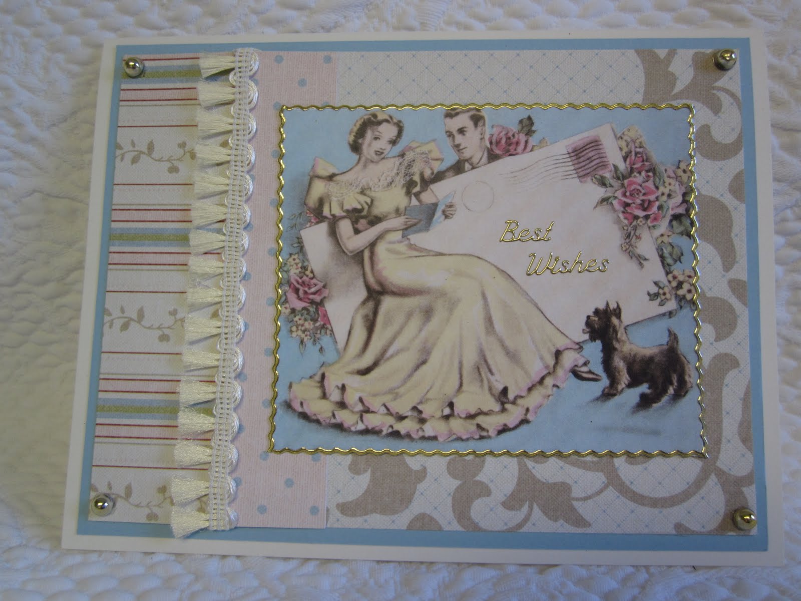 I was craving vintage so where better to find it than Peggy Loves Vintage printable images. I pulled out the Scottish CD Volume 1 and besides all of the adorable little Scottie dogs I fell in love with this romantic couple (and the little doggie's pretty darn cute, too). I'm low on anniversary cards in my stash and thought this would make a lovely one, or perhaps for a wedding so I chose a Best Wishes peel-off sentiment. WooHoo, double duty! The coordinating papers are from Making Memories. I trimmed the image with some more peelie borders, added some adhesive beads and some gorgeous tassel trim (thanks Kellie) and had a beautiful card in minutes.